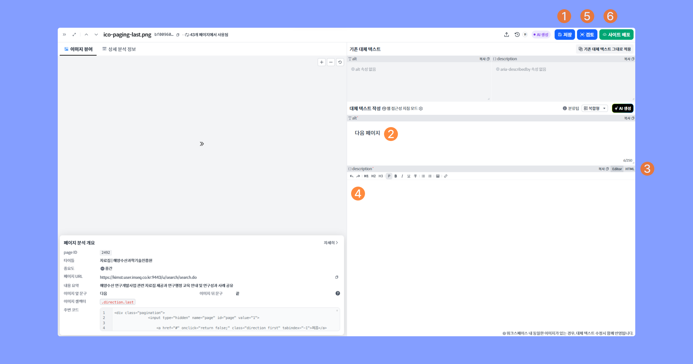 검토버튼이 활성화돼요.각 이미지 유형별 검토 방법에 따라 에디터에서 대체 텍스트 검토를 진행해주세요.