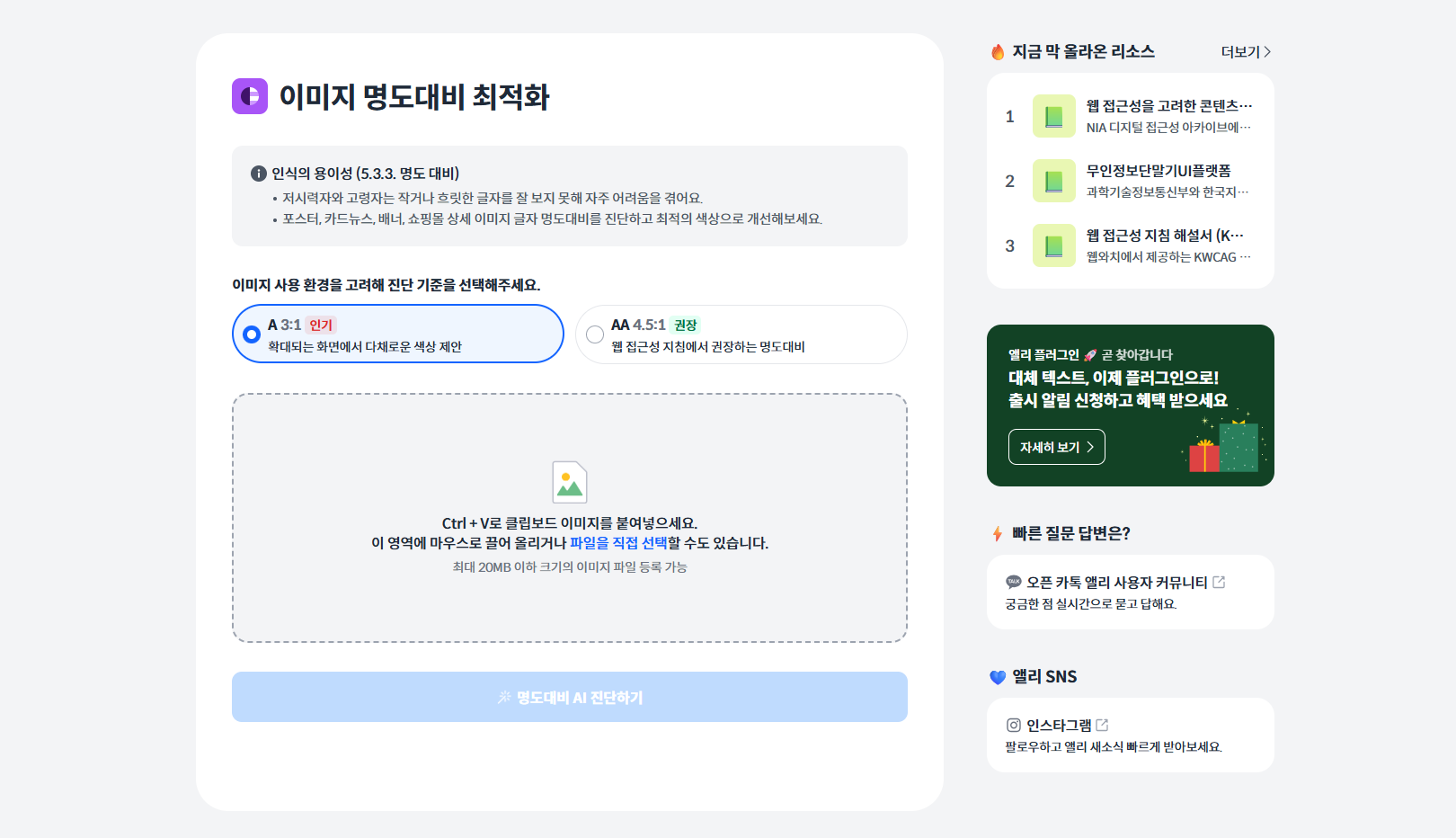 명도대비 AI 진단하기버튼 클릭확대 가능한 콘텐츠 명도비(3:1)와 웹접근성 권장 명도비(4.5:1)를 선택할 수 있어요.