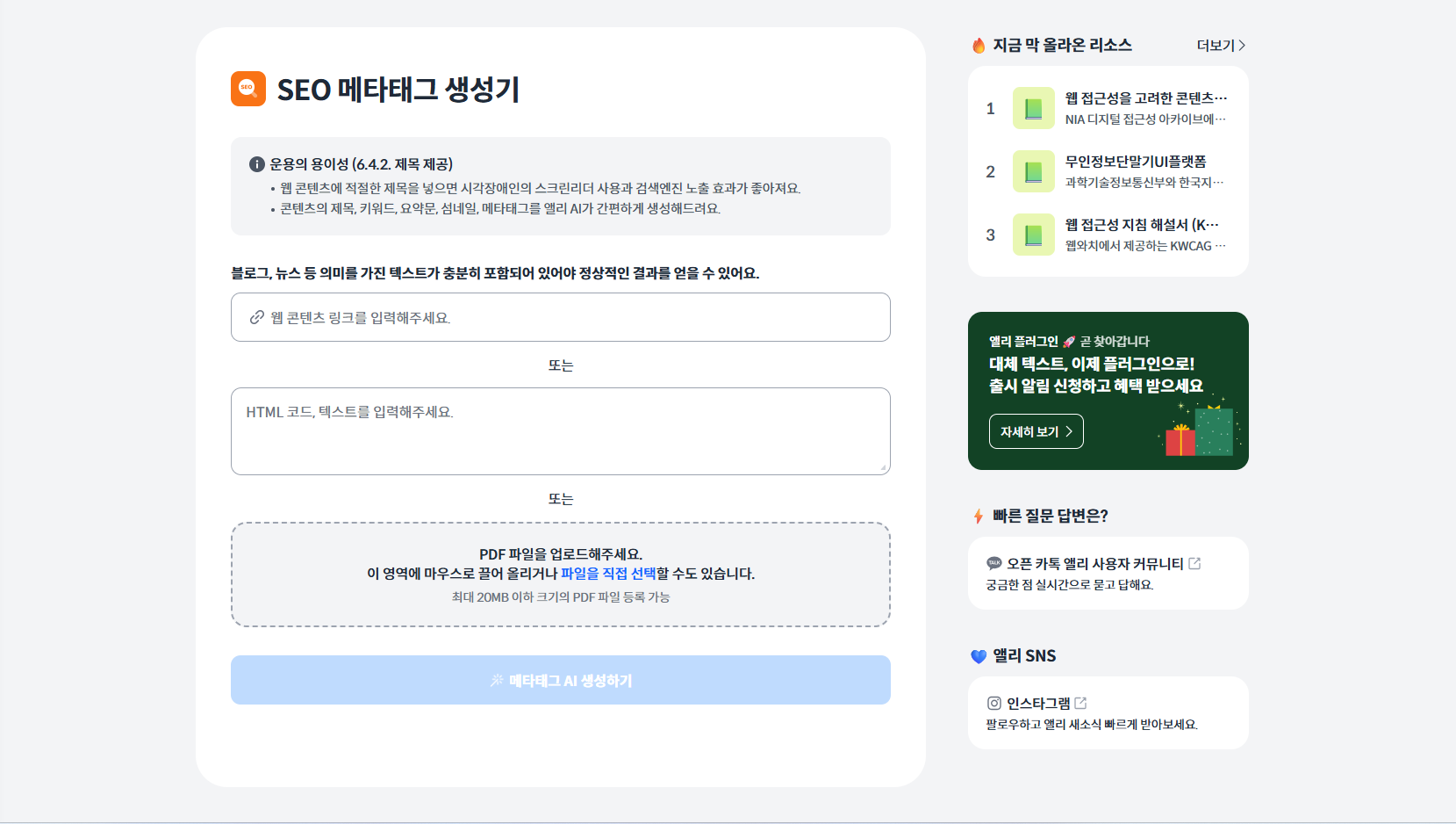 콘텐츠의 제목, 키워드, 요약문, 섬네일, 메타태그를 앨리 AI가 간편하게 생성해드려요.